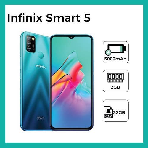 Smart 5 smartphone runs on Android v10 operating system. The phone is powered by Quad core, 1.3 GHz processor. Infinix Smart 5 smartphone has a 6.6-inch IPS LCD display. It runs on the MediaTek MT6580 Chipset. It has 2GB RAM and 32GB internal storage. It is backed by a 5000 mAh battery.