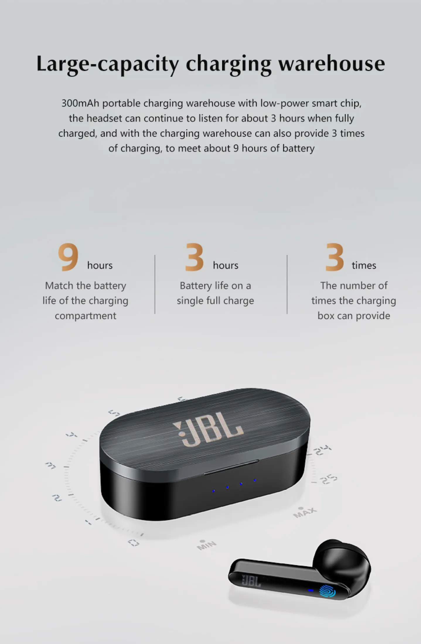 | Standby time: | About 100 HRS if one earbud on. 60hrs if bothearbuds on |