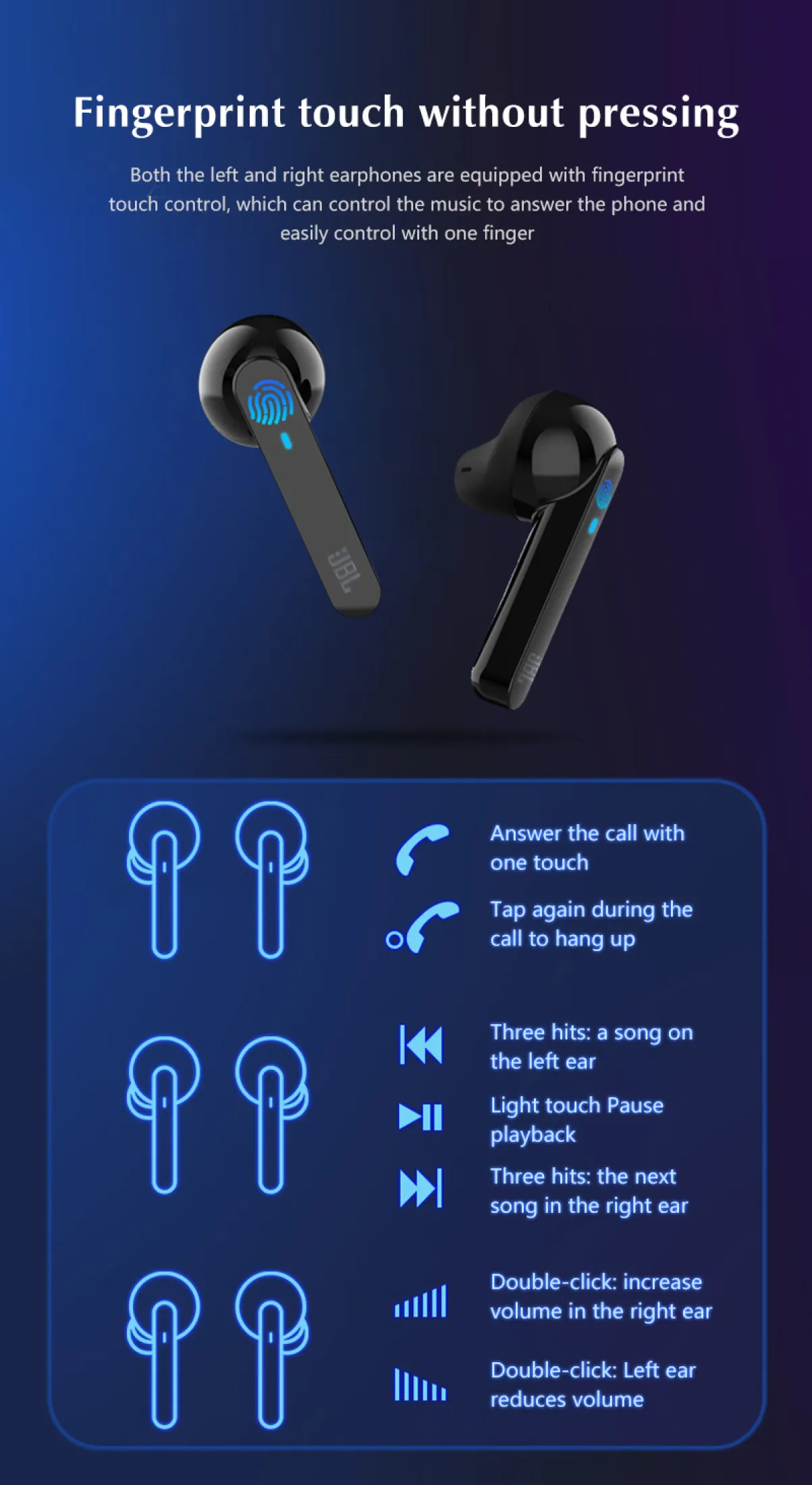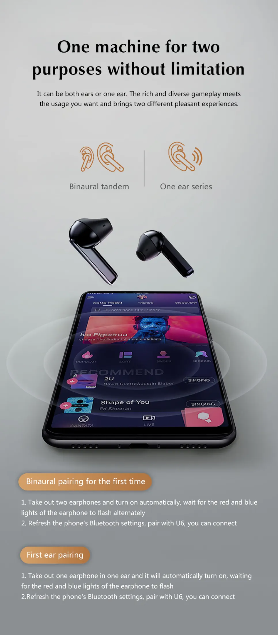 1. The Single – ear connection: Take out the earbud and start it automatically in the charging modeLong press the multi – function button to start it. At this time the red and blue towns flashingalternately, Open the mobile phone bluetooth can search for connection, also support otherany bluetooth device in connecting to listen to music or dial the phone