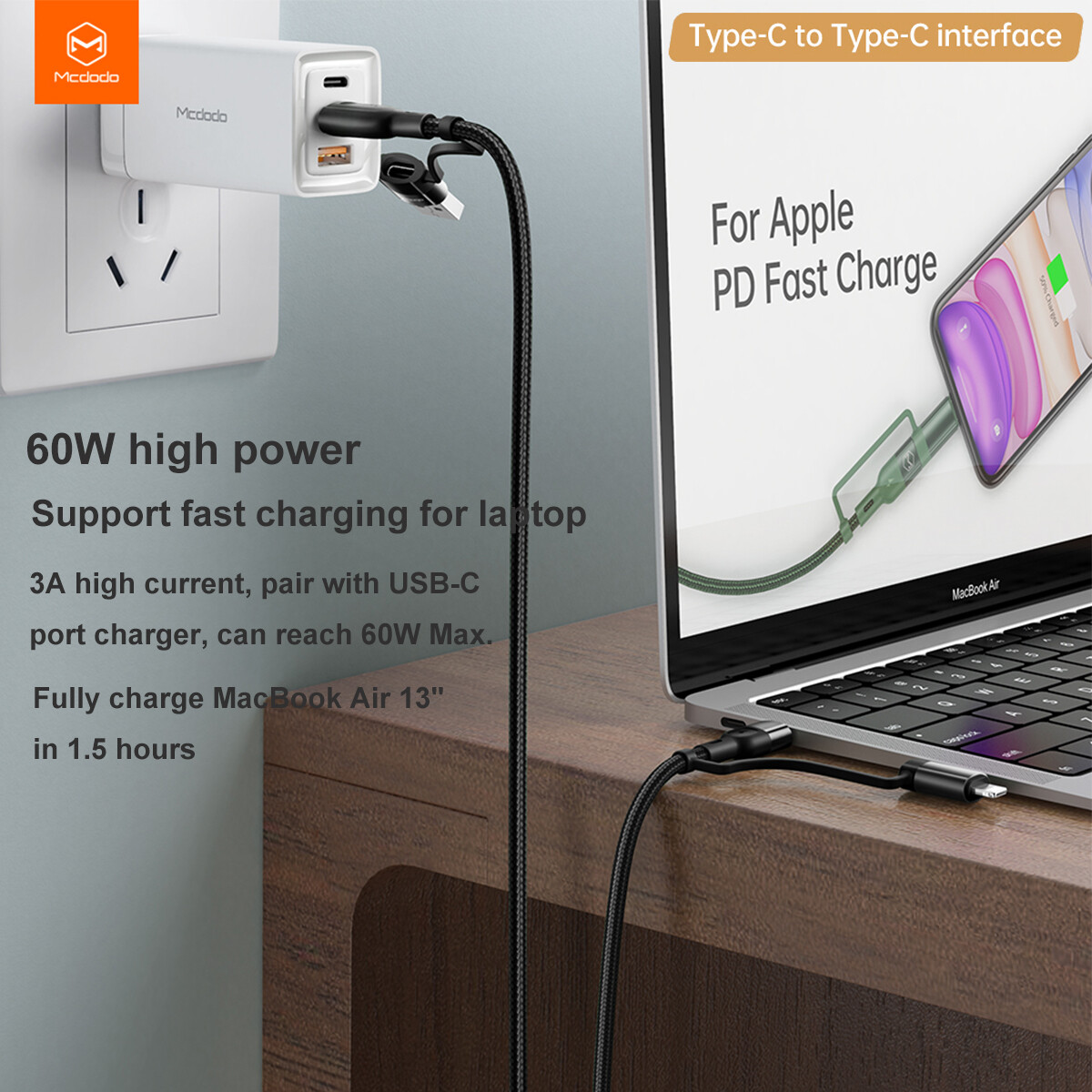 60W high power, Support fast charging for laptop, 3A high current , pair with USB-C port charger, can reach 60W Max, Fully charge Macbook Air 13″ 1.5 hours.